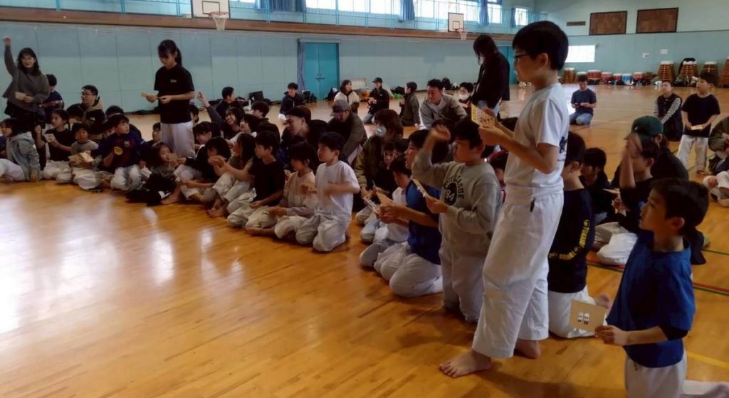 今年最後の日曜練習に、4チームに分かれて形・組手の団体戦を行いました。そのあとお父さんお母さんも参加して親子スポーツレクリエーションを行いました、フラフープくぐり、ゴロゴロ丸太運び、輪ゴムからの脱出、暗闇チャンバラ、ドッチビーと恒例のゲームからオリジナル遊びと大変盛り上がりました。そして最後にビンゴ大会、お菓子やゲームなどの景品にテンション最高潮に。